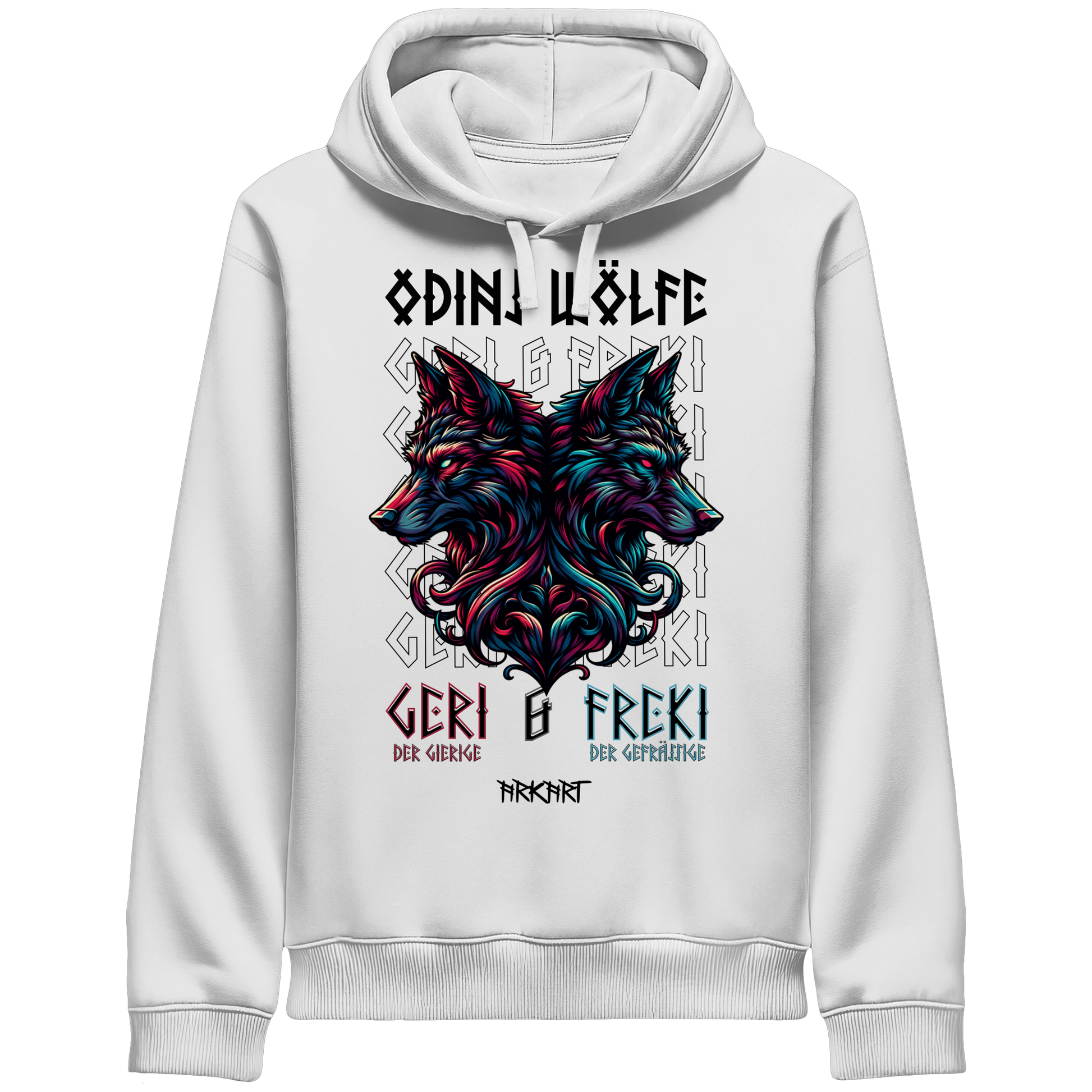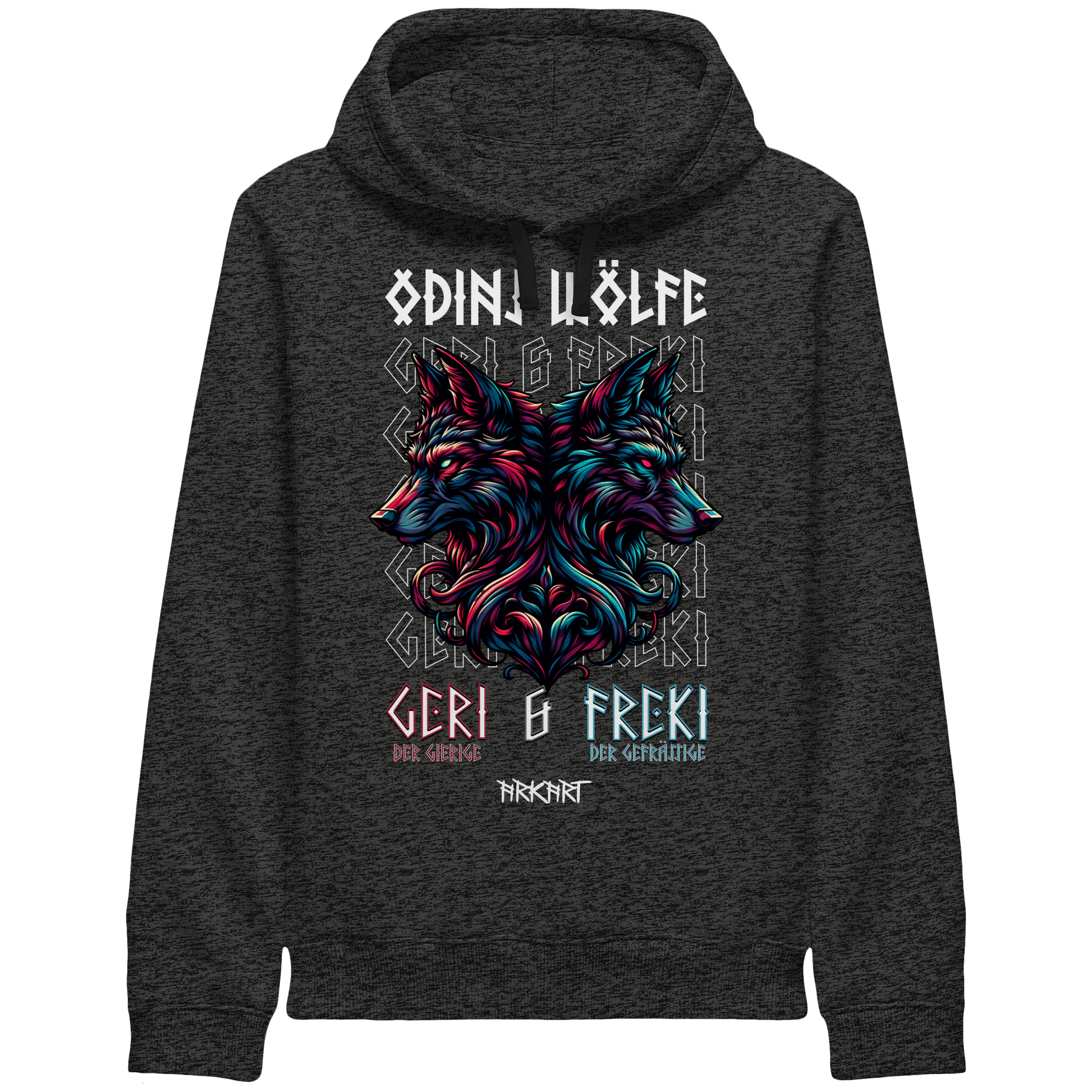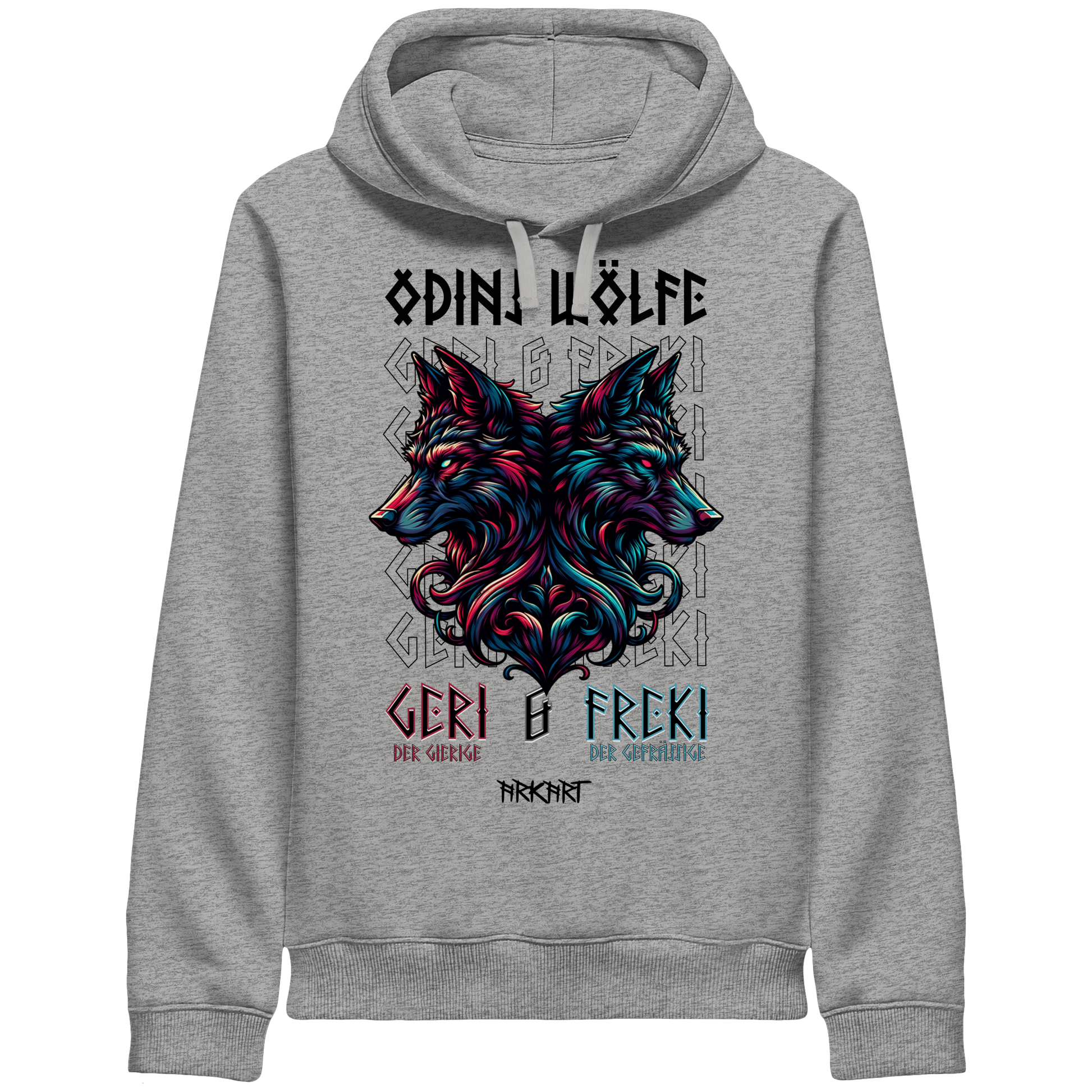Die beiden Wölfe Geri (der Gierige) und Freki (der Gefräßige) begleiten Odin seit Anbeginn der Zeit. Sie verkörpern die wilde Seite der göttlichen Macht. In den alten Mythen stehen sie für Mut, Loyalität und den unbedingten Willen zu überleben. Dieses Motiv symbolisiert Treue, Instinkt und unbändige Lebenskraft.
