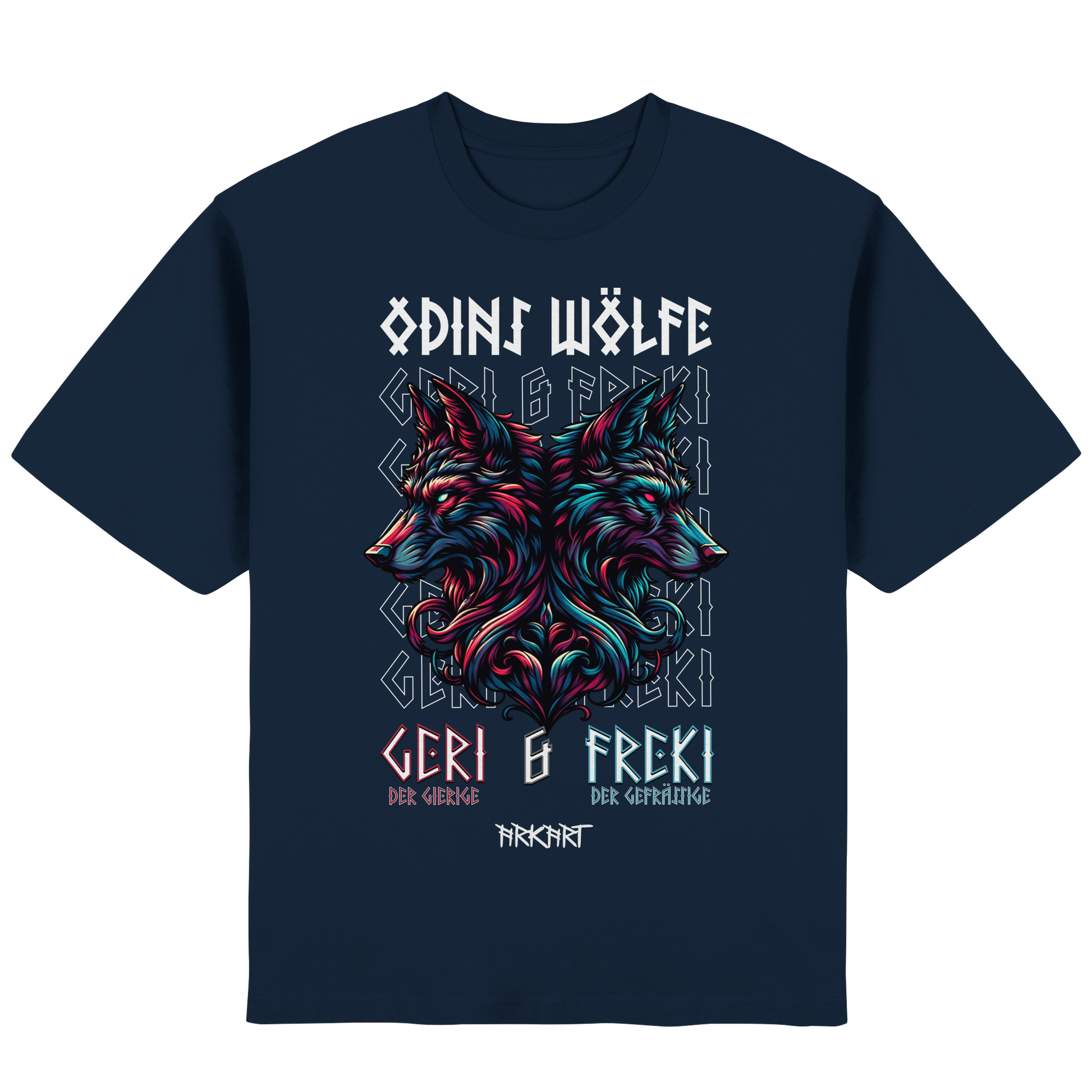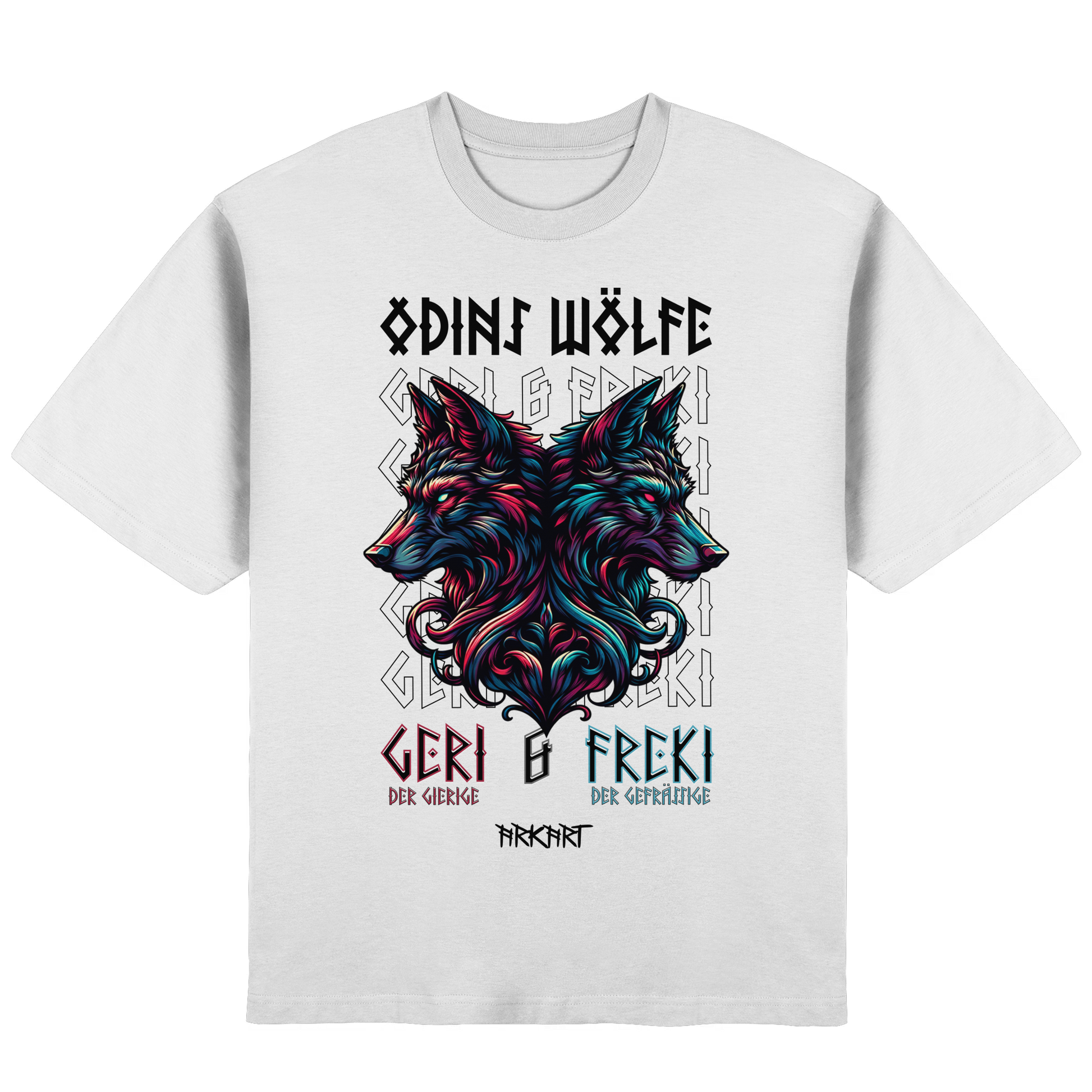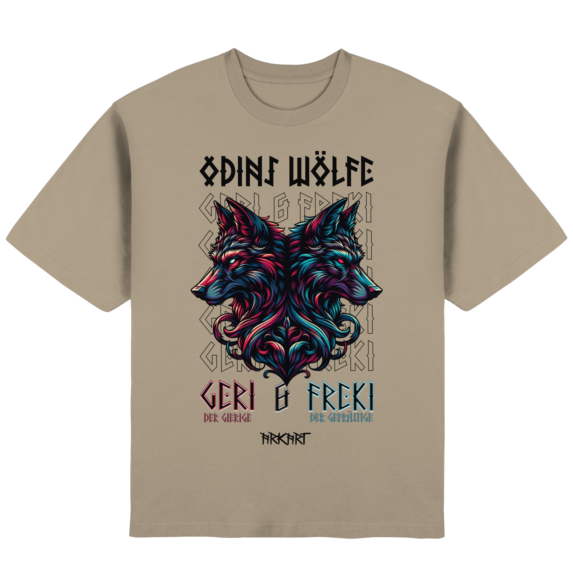 Die beiden Wölfe Geri (der Gierige) und Freki (der Gefräßige) begleiten Odin seit Anbeginn der Zeit. Sie verkörpern die wilde Seite der göttlichen Macht. In den alten Mythen stehen sie für Mut, Loyalität und den unbedingten Willen zu überleben. Dieses Motiv symbolisiert Treue, Instinkt und unbändige Lebenskraft.