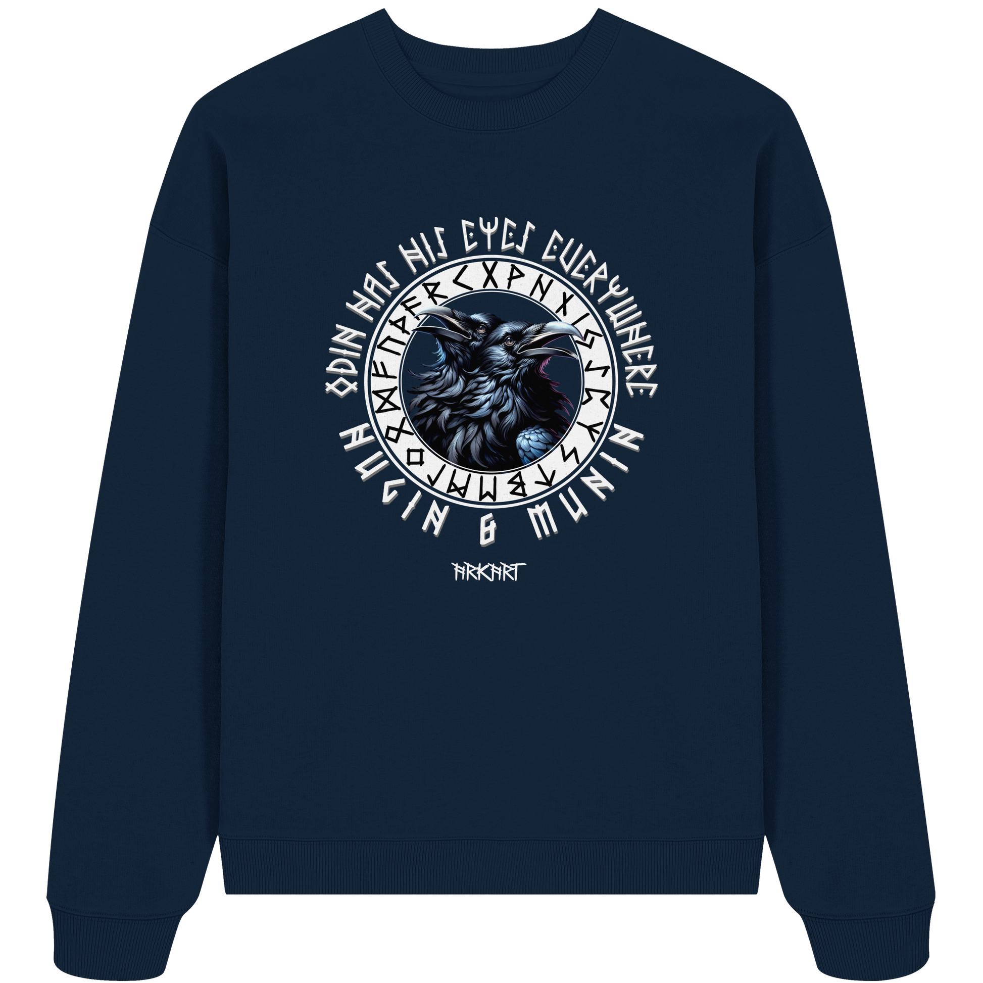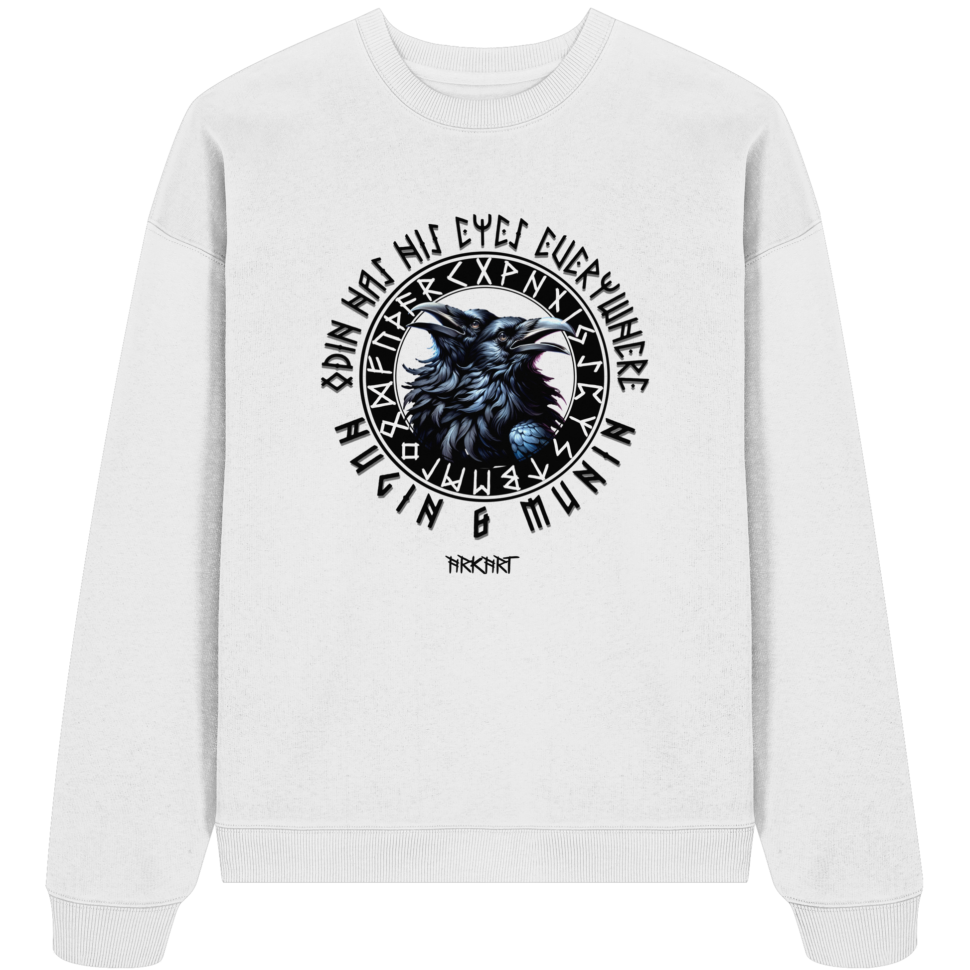 Die beiden Raben Hugin ("Gedanke") und Munin ("Erinnerung") sind treue Begleiter des Allvaters Odin. Jeden Tag fliegen sie hinaus in die Welt um Wissen und Nachrichten zu sammeln, die sie ihrem Herrn ins Ohr flüstern. In der nordischen Mythologie stehen sie für Weisheit und die Verbindung zwischen Geist und Erinnerung. Ein Shirt mit Hugin & Munin ist mehr als nur ein Motiv - es ist ein Symbol für Klarheit, Wissen und den Mut, die Welt mit offenen Augen zu betrachten.