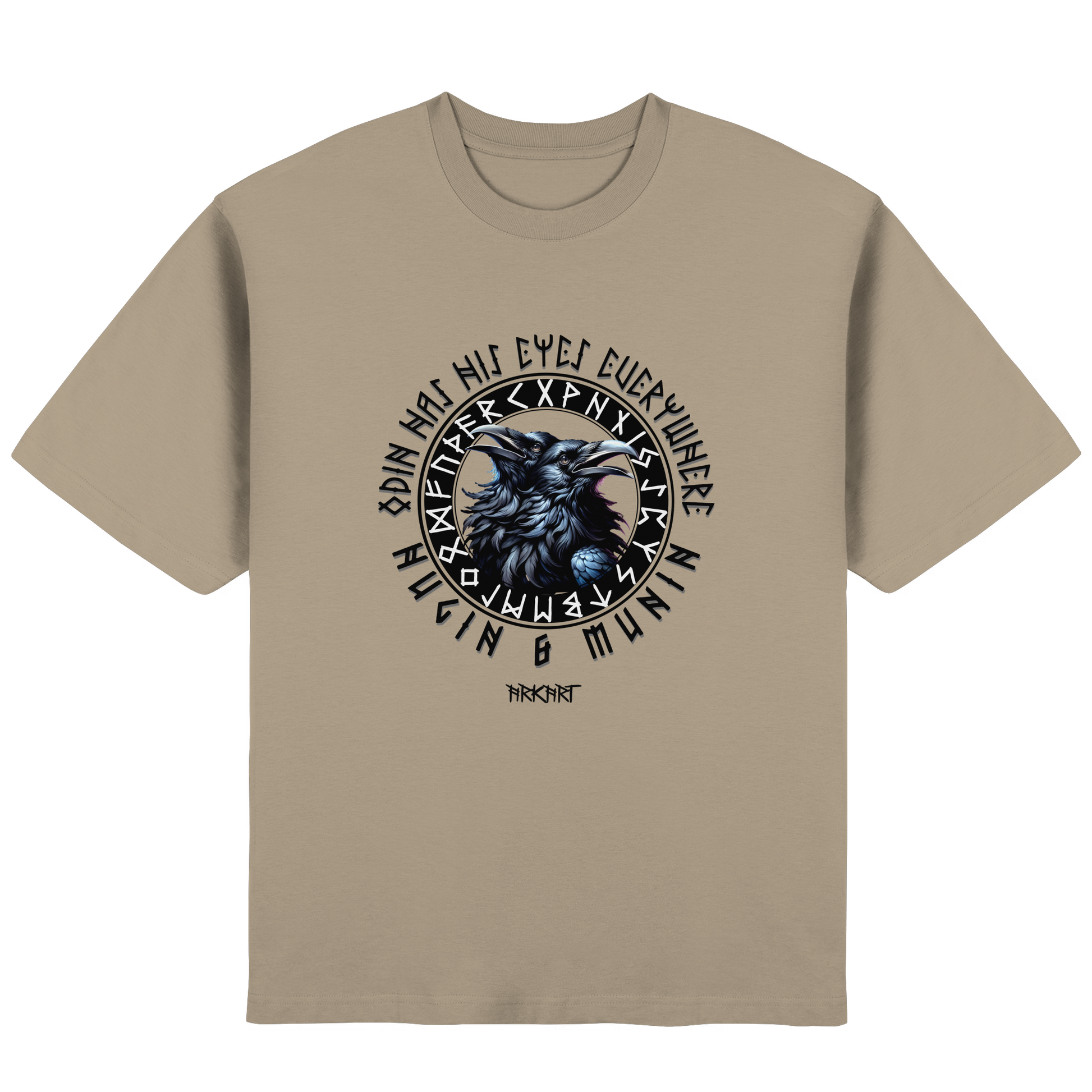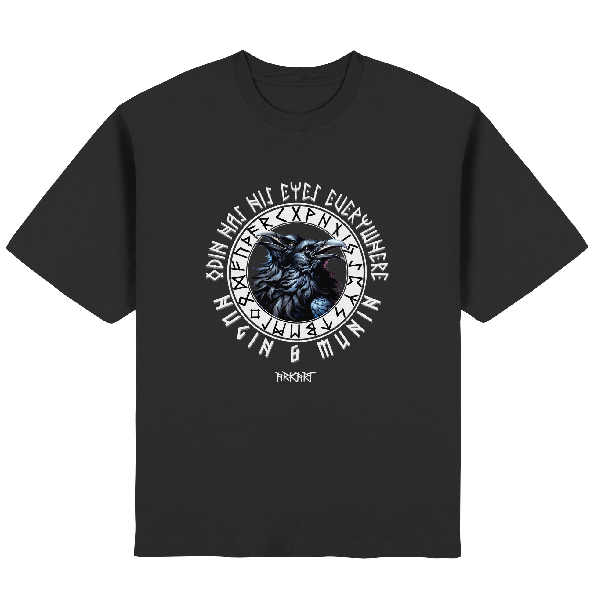Die beiden Raben Hugin ("Gedanke") und Munin ("Erinnerung") sind treue Begleiter des Allvaters Odin. Jeden Tag fliegen sie hinaus in die Welt um Wissen und Nachrichten zu sammeln, die sie ihrem Herrn ins Ohr flüstern. In der nordischen Mythologie stehen sie für Weisheit und die Verbindung zwischen Geist und Erinnerung. Ein Shirt mit Hugin & Munin ist mehr als nur ein Motiv - es ist ein Symbol für Klarheit, Wissen und den Mut, die Welt mit offenen Augen zu betrachten.
