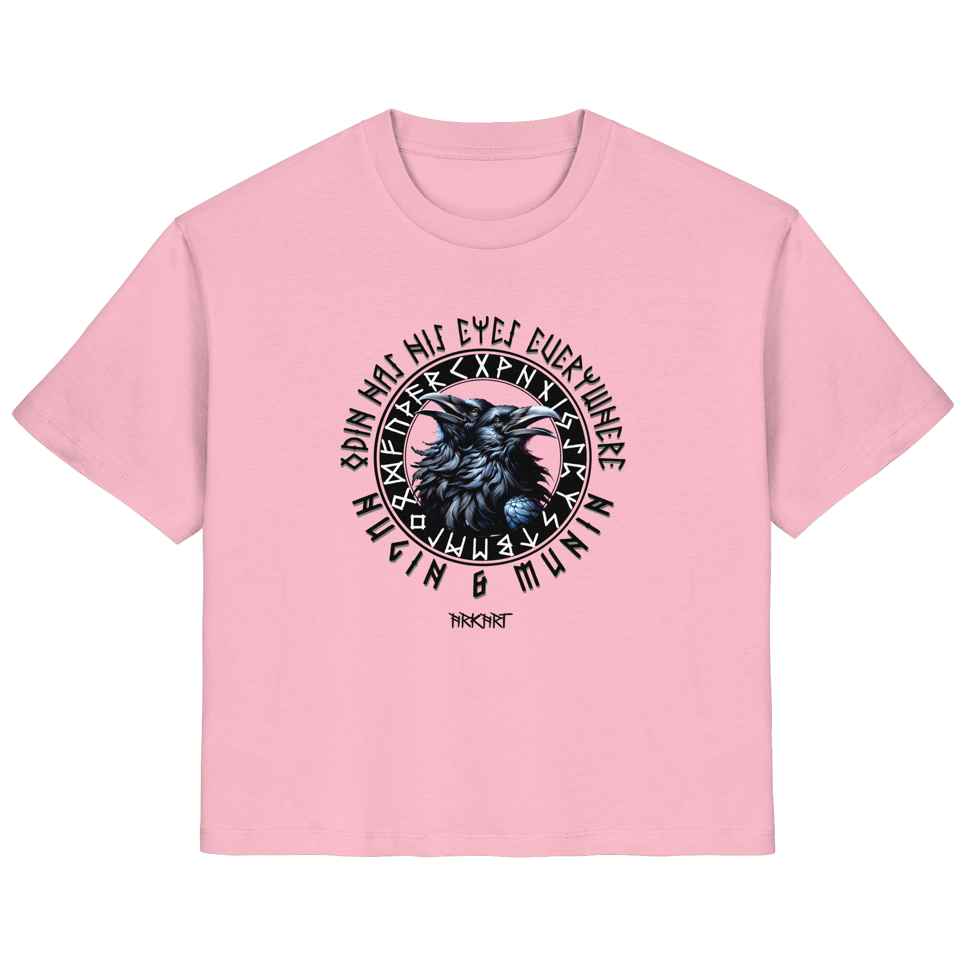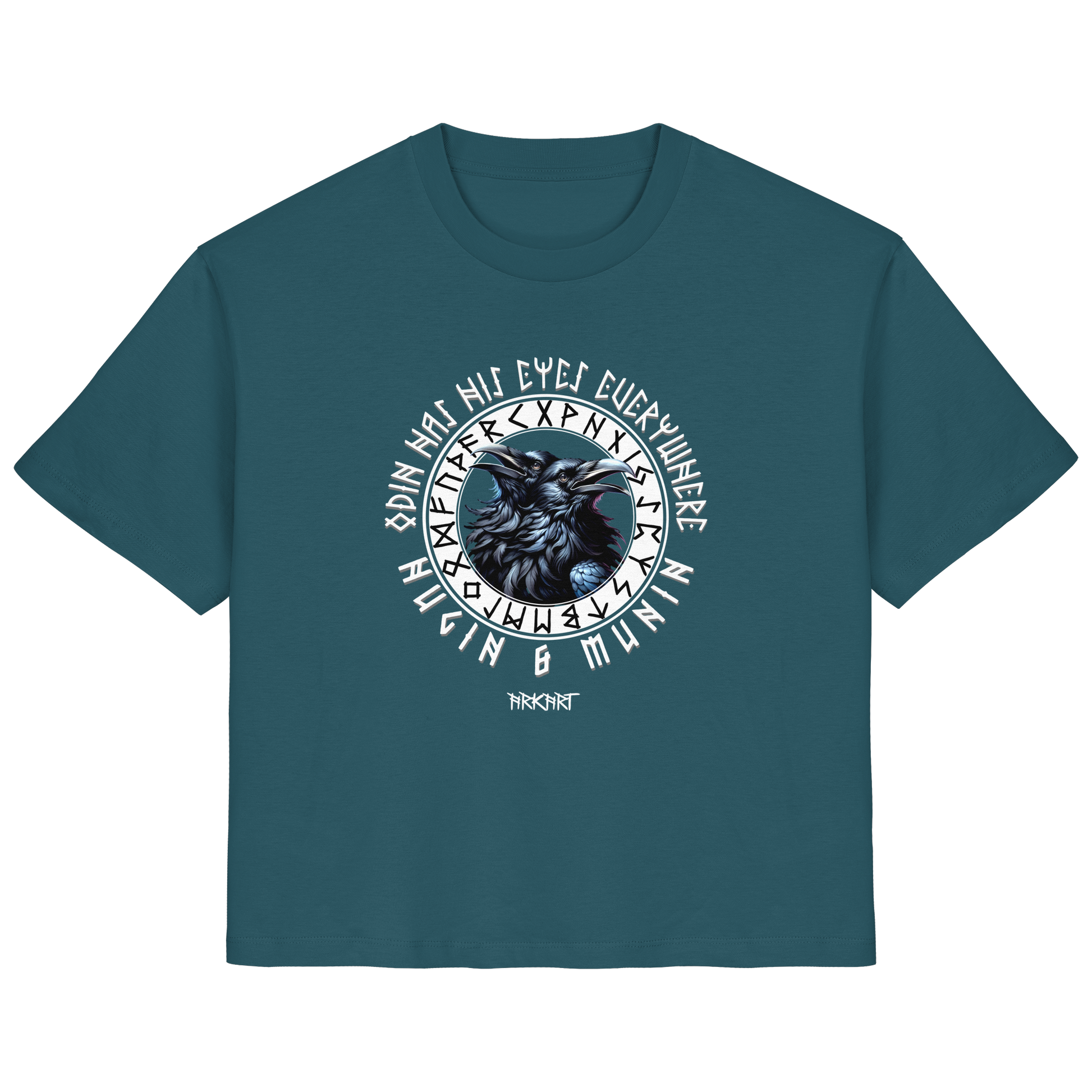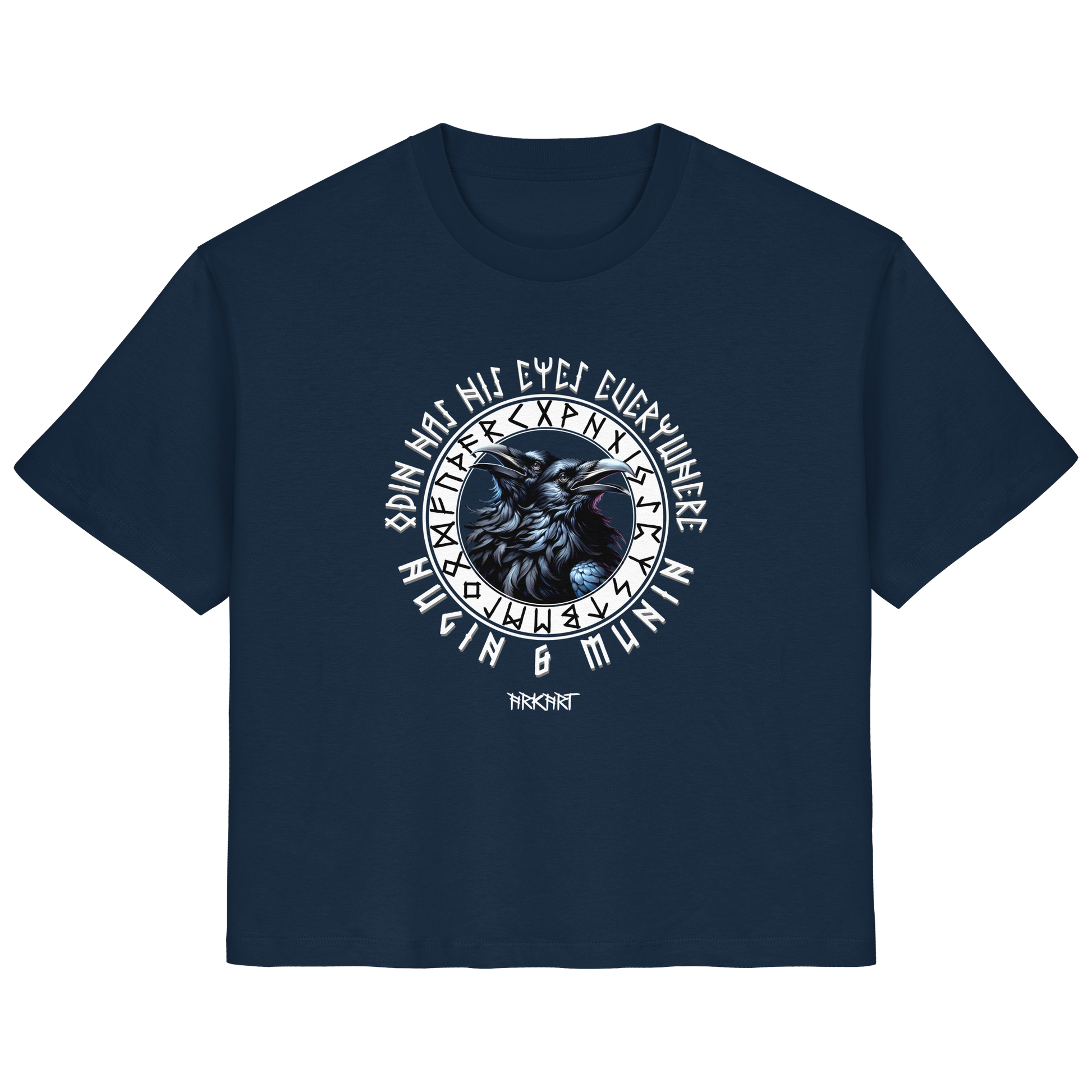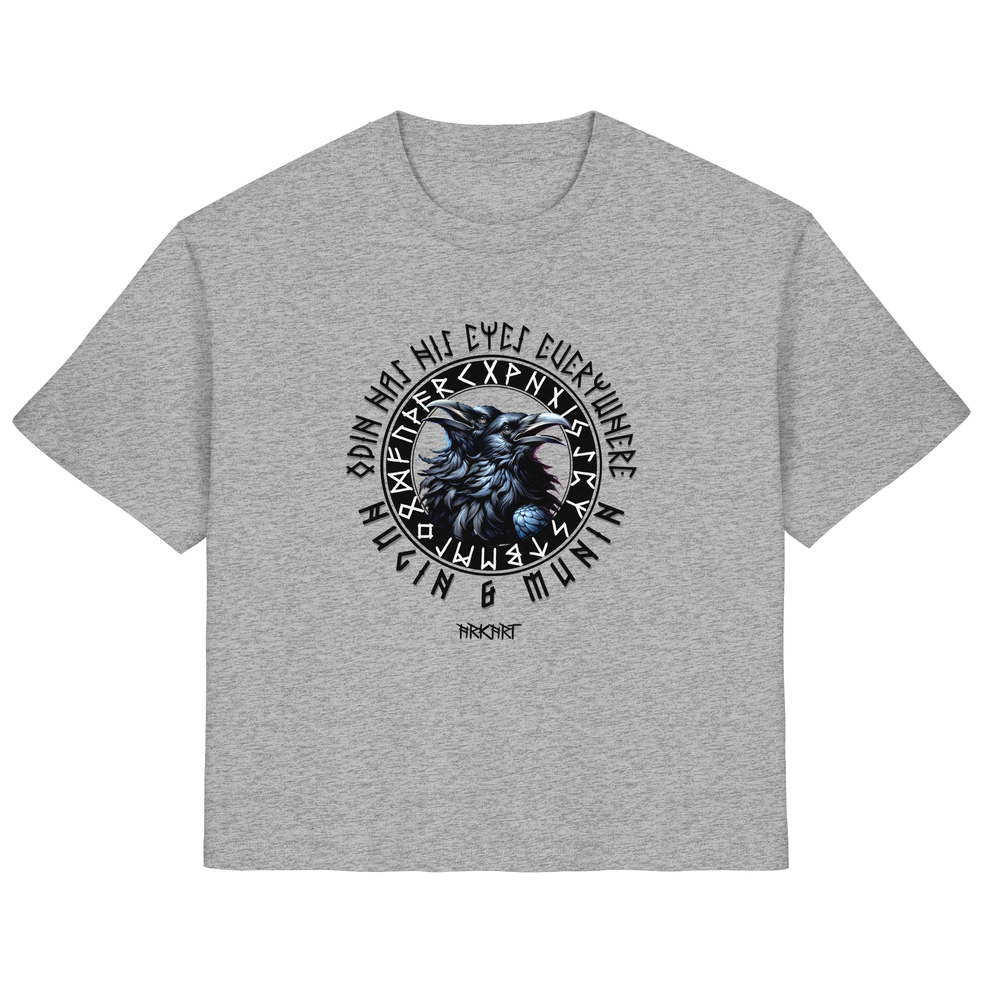 Die beiden Raben Hugin ("Gedanke") und Munin ("Erinnerung") sind treue Begleiter des Allvaters Odin. Jeden Tag fliegen sie hinaus in die Welt um Wissen und Nachrichten zu sammeln, die sie ihrem Herrn ins Ohr flüstern. In der nordischen Mythologie stehen sie für Weisheit und die Verbindung zwischen Geist und Erinnerung. Ein Shirt mit Hugin & Munin ist mehr als nur ein Motiv - es ist ein Symbol für Klarheit, Wissen und den Mut, die Welt mit offenen Augen zu betrachten.