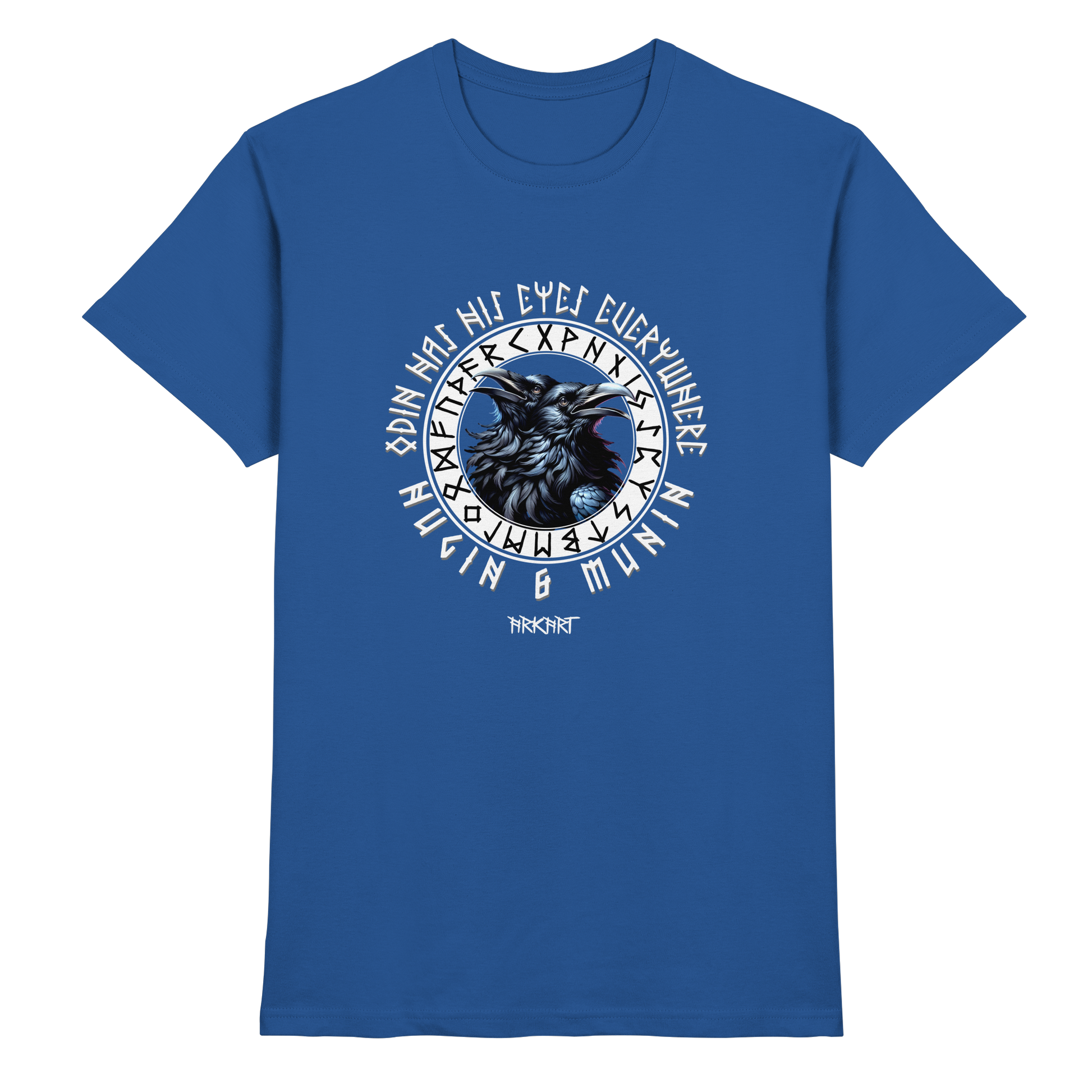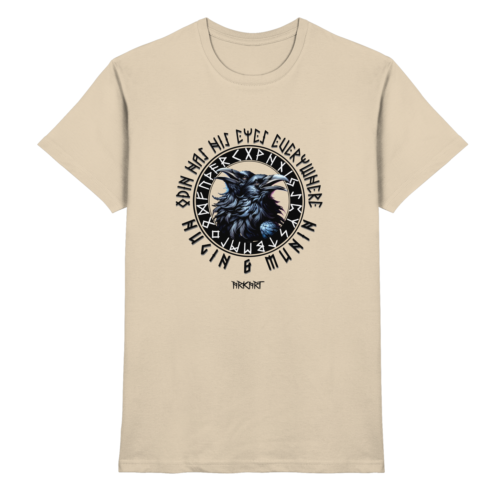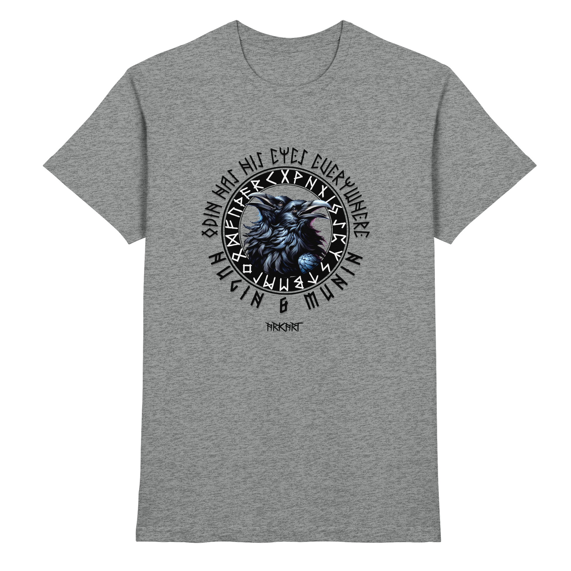 Die beiden Raben Hugin ("Gedanke") und Munin ("Erinnerung") sind treue Begleiter des Allvaters Odin. Jeden Tag fliegen sie hinaus in die Welt um Wissen und Nachrichten zu sammeln, die sie ihrem Herrn ins Ohr flüstern. In der nordischen Mythologie stehen sie für Weisheit und die Verbindung zwischen Geist und Erinnerung. Ein Shirt mit Hugin & Munin ist mehr als nur ein Motiv - es ist ein Symbol für Klarheit, Wissen und den Mut, die Welt mit offenen Augen zu betrachten.
