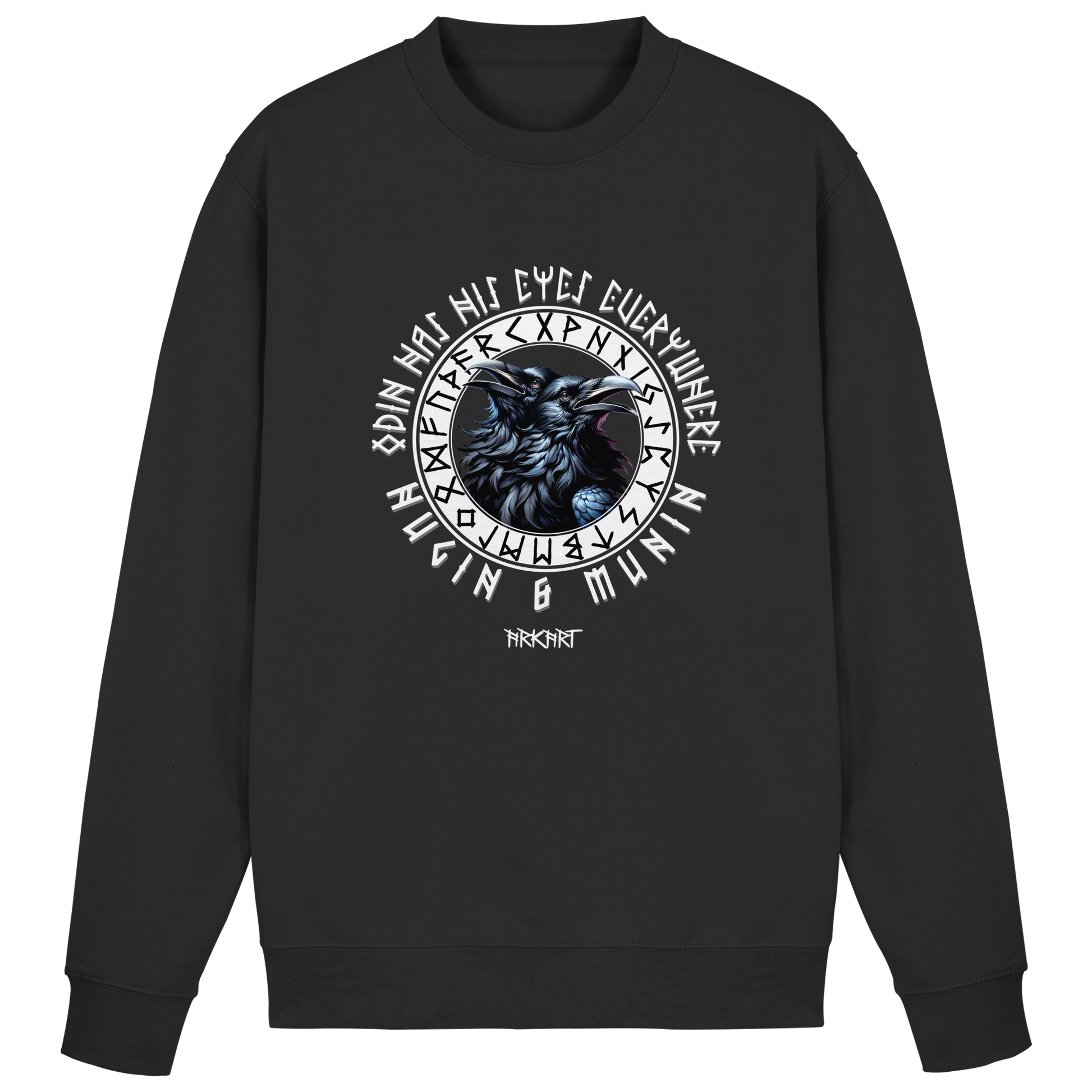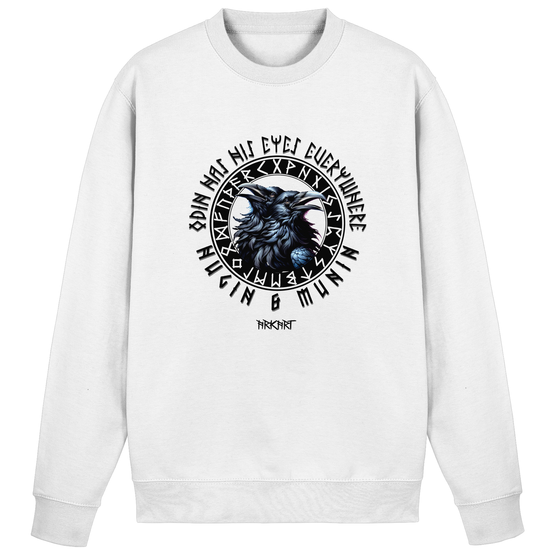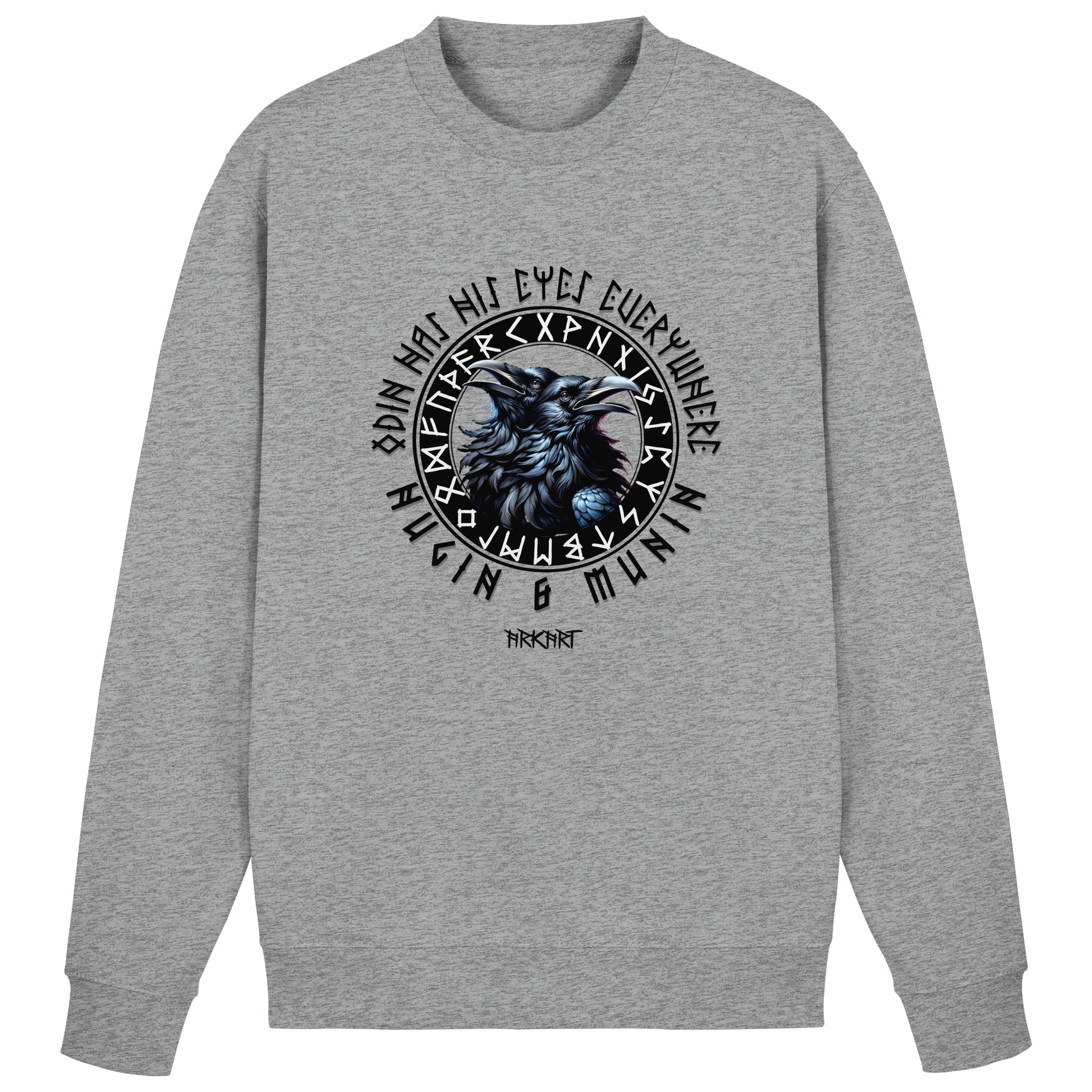 Die beiden Raben Hugin ("Gedanke") und Munin ("Erinnerung") sind treue Begleiter des Allvaters Odin. Jeden Tag fliegen sie hinaus in die Welt um Wissen und Nachrichten zu sammeln, die sie ihrem Herrn ins Ohr flüstern. In der nordischen Mythologie stehen sie für Weisheit und die Verbindung zwischen Geist und Erinnerung. Ein Shirt mit Hugin & Munin ist mehr als nur ein Motiv - es ist ein Symbol für Klarheit, Wissen und den Mut, die Welt mit offenen Augen zu betrachten.