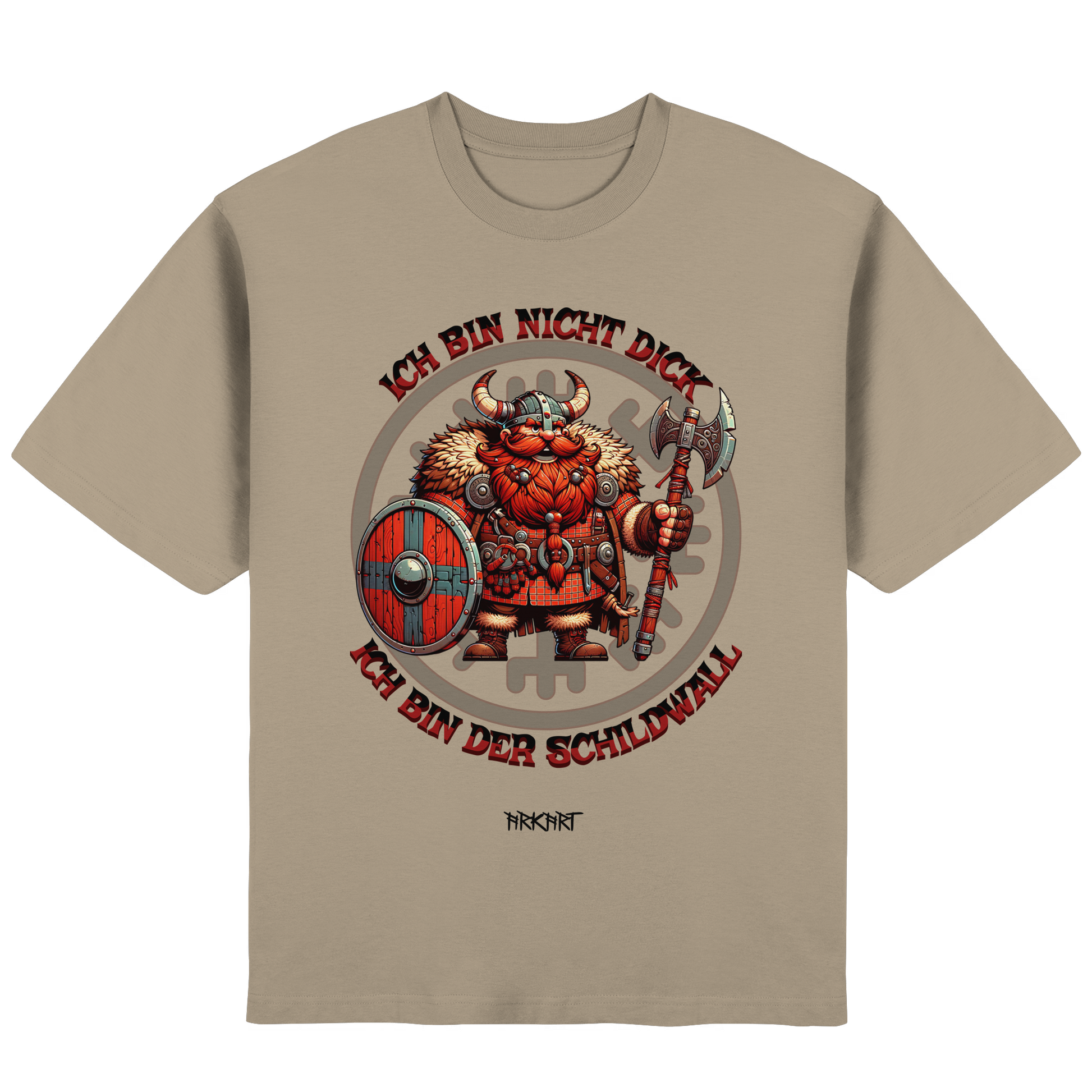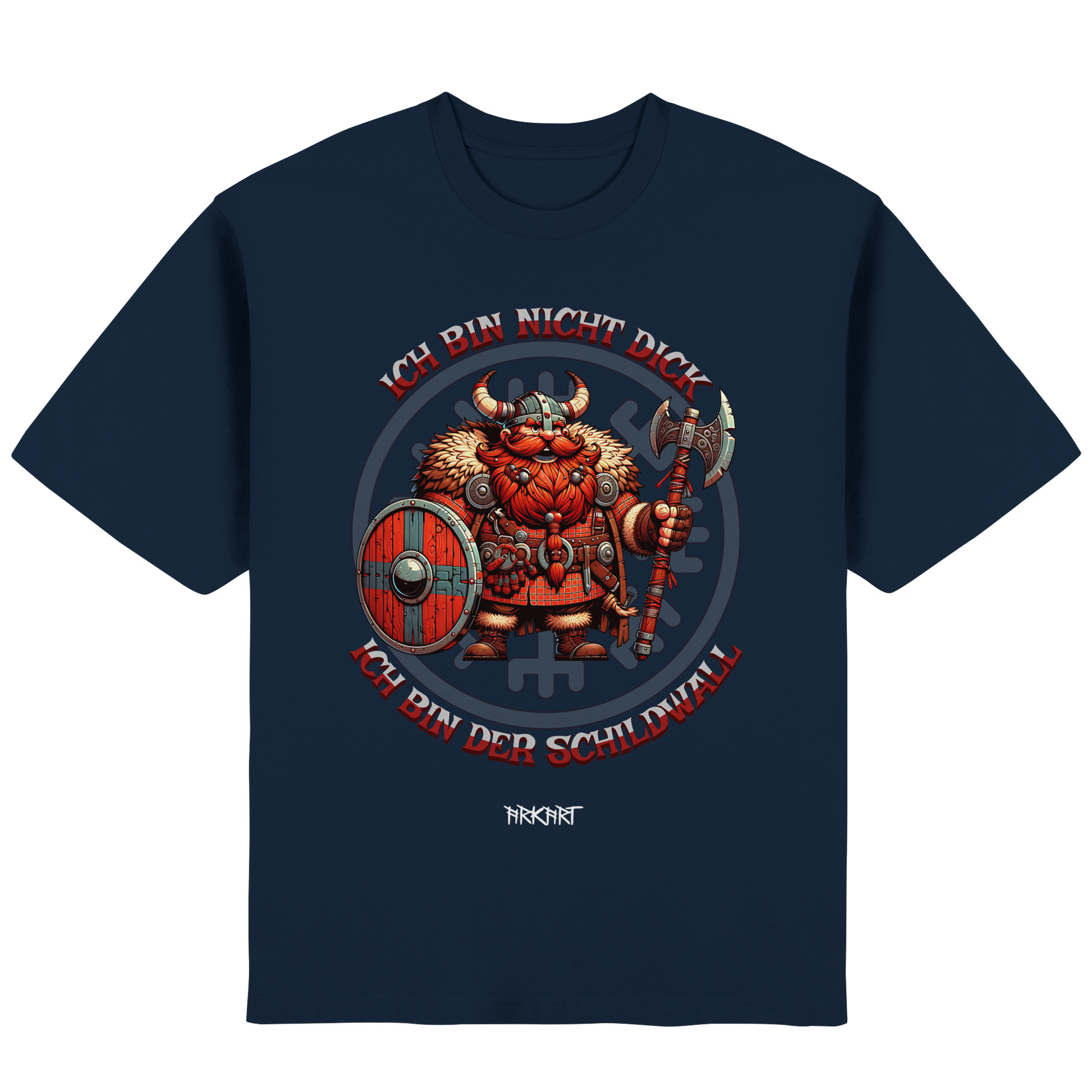 Dieses Motiv nimmt die nordische Stärke mit einem Augenzwinkern. Ein kräftiger Wikinger mit Schild steht stolz für seine Linie – denn was andere „dick“ nennen, ist in Wahrheit reine Verteidigungskraft. Der Spruch ist ein Statement für Humor, Selbstbewusstsein und echte Nordmann-Mentalität.