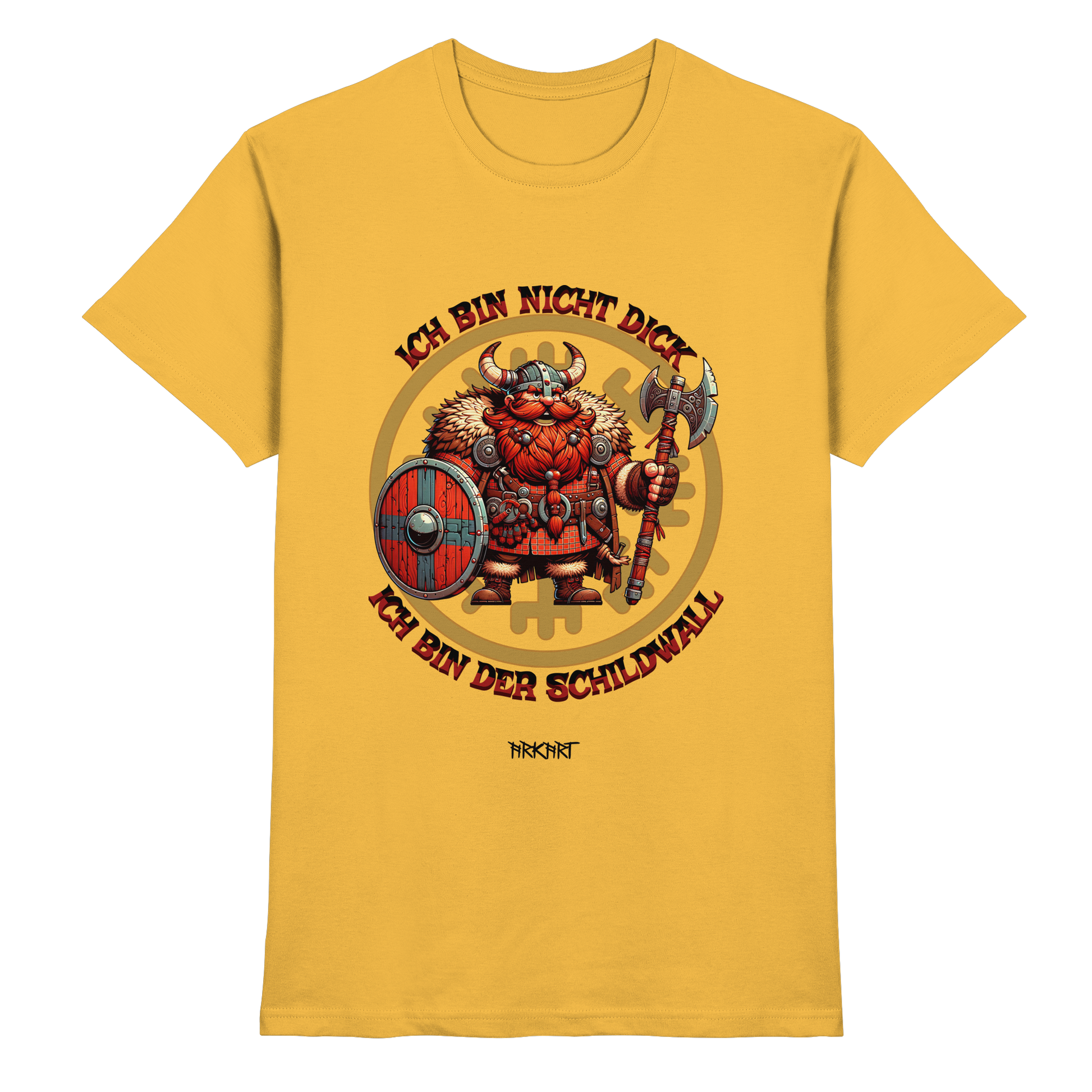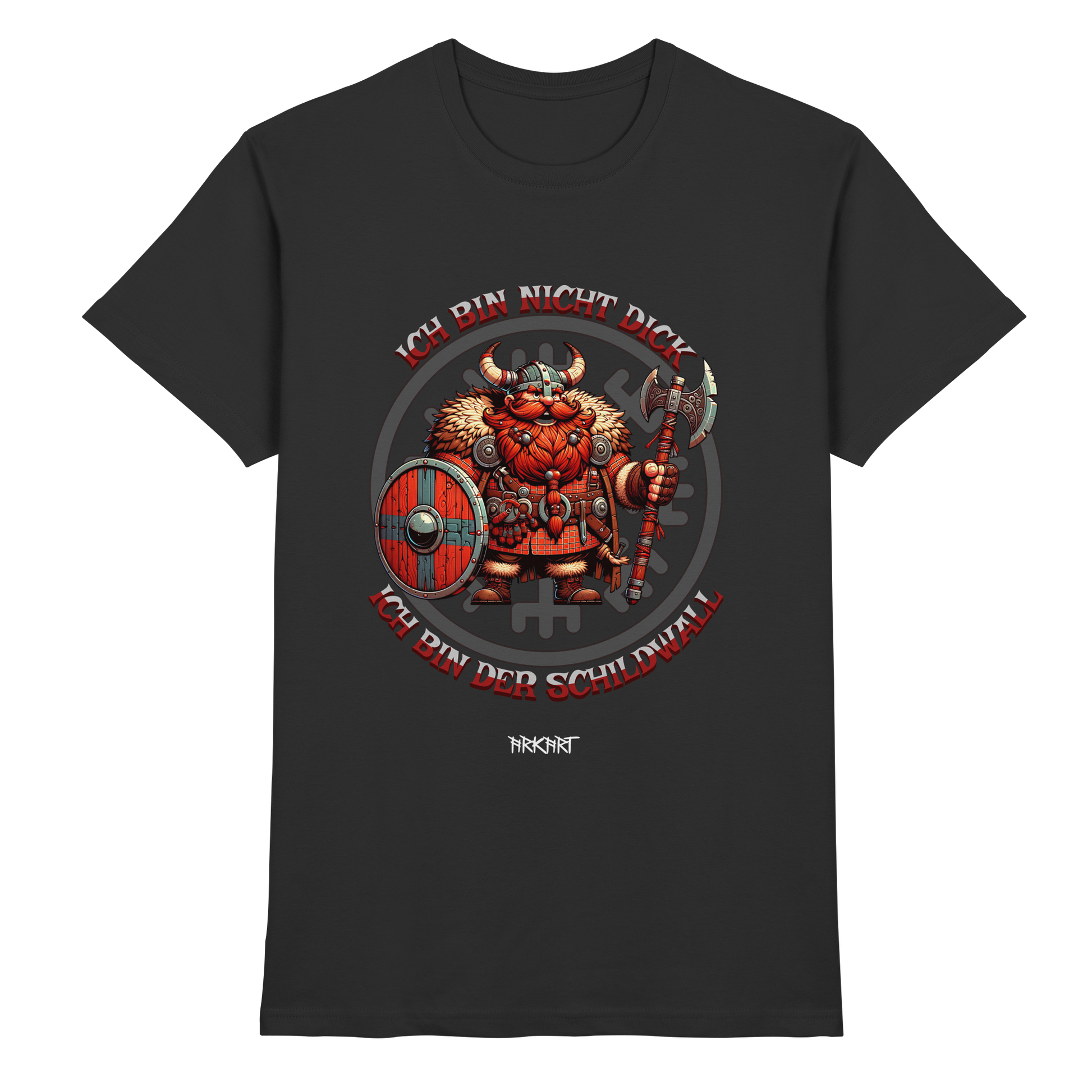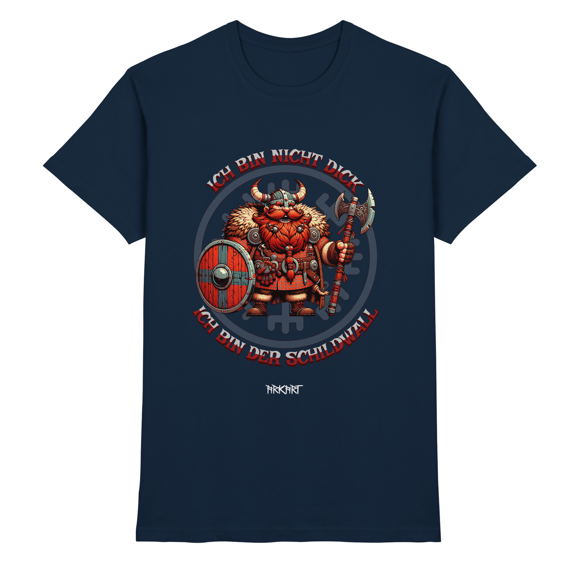 Dieses Motiv nimmt die nordische Stärke mit einem Augenzwinkern. Ein kräftiger Wikinger mit Schild steht stolz für seine Linie – denn was andere „dick“ nennen, ist in Wahrheit reine Verteidigungskraft. Der Spruch ist ein Statement für Humor, Selbstbewusstsein und echte Nordmann-Mentalität.