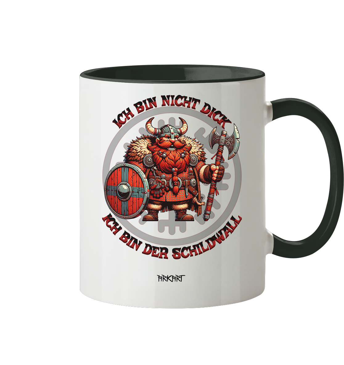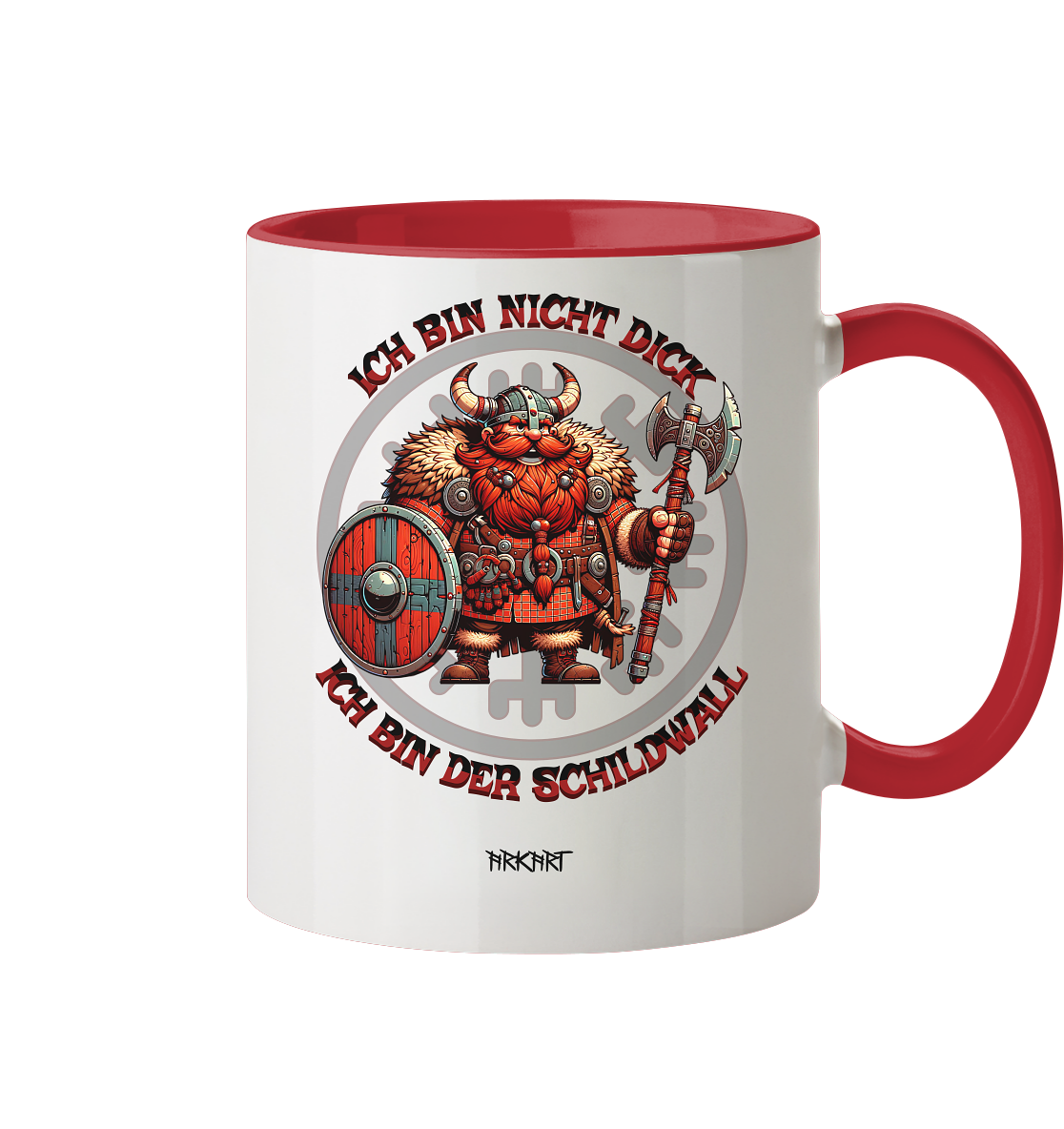 Dieses Motiv nimmt die nordische Stärke mit einem Augenzwinkern. Ein kräftiger Wikinger mit Schild steht stolz für seine Linie – denn was andere „dick“ nennen, ist in Wahrheit reine Verteidigungskraft. Der Spruch ist ein Statement für Humor, Selbstbewusstsein und echte Nordmann-Mentalität.