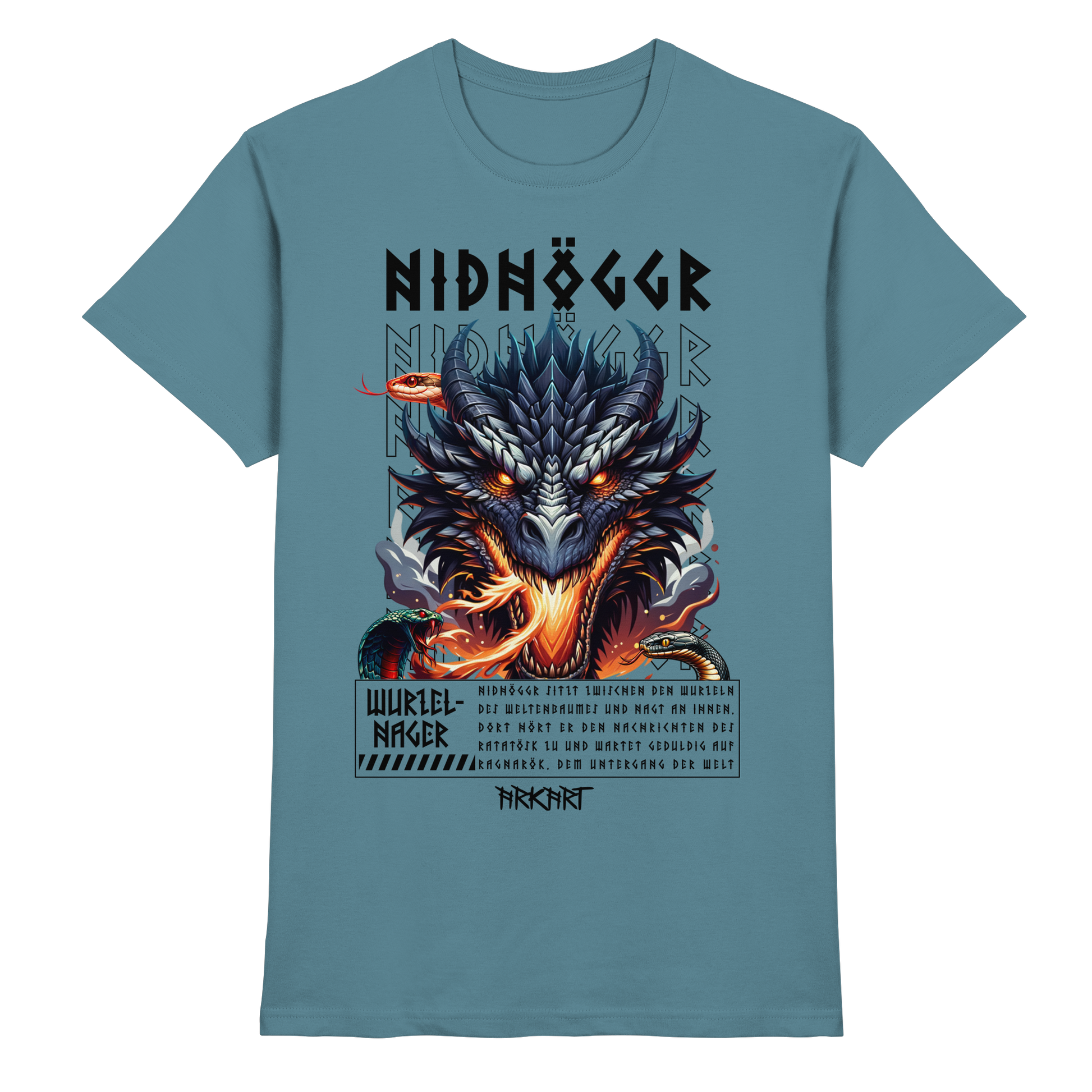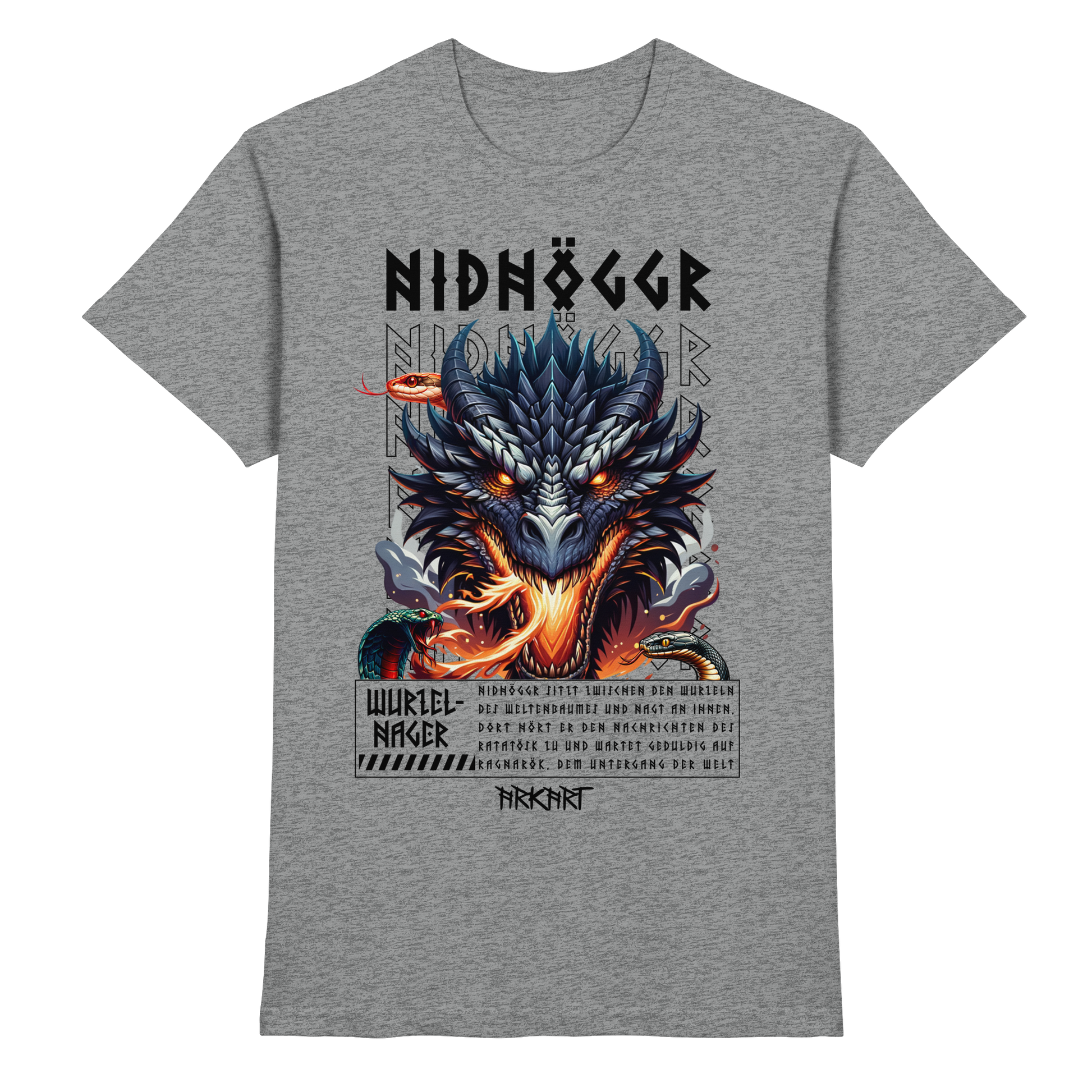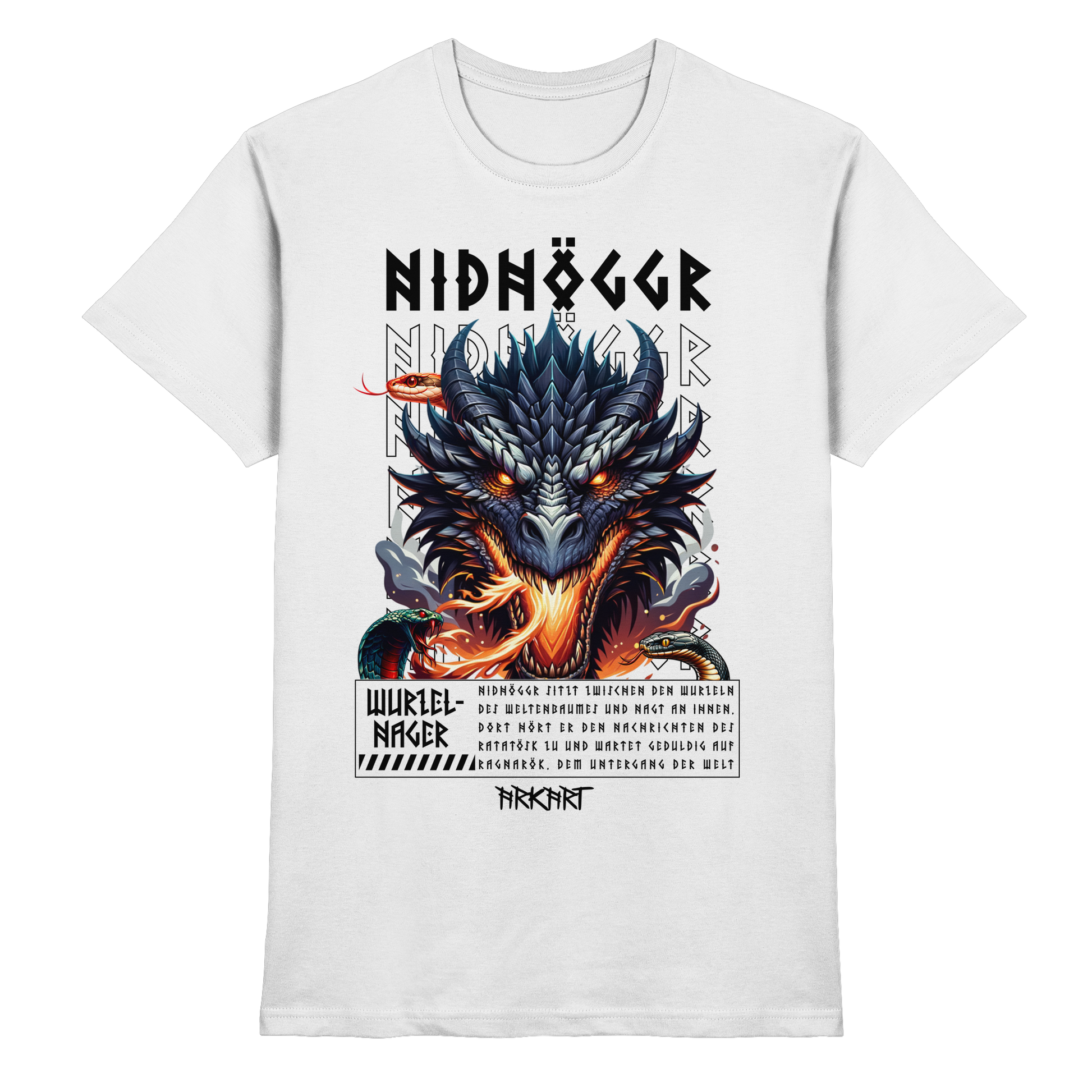 Als gewaltiger Drache lebt Nidhöggr zwischen den Wurzeln des Weltenbaumes Yggdrasil. Dort nagt er stetig an der dritten Wurzel des Baumes, direkt über der Quelle Hvergelmir in Niflheim die ebenso Heimat abertausender weiter Schlagen ist. Er hofft so den Baum zu schwächen und damit den Untergang der Welt, Ragnarök einzuleiten und aus Niflheim aufzusteigen. Währenddessen tauscht es über das Ratatösk Informationen - und gerne auch Beleidigungen - mit dem Adler in der Krone des Weltenbaumes aus.