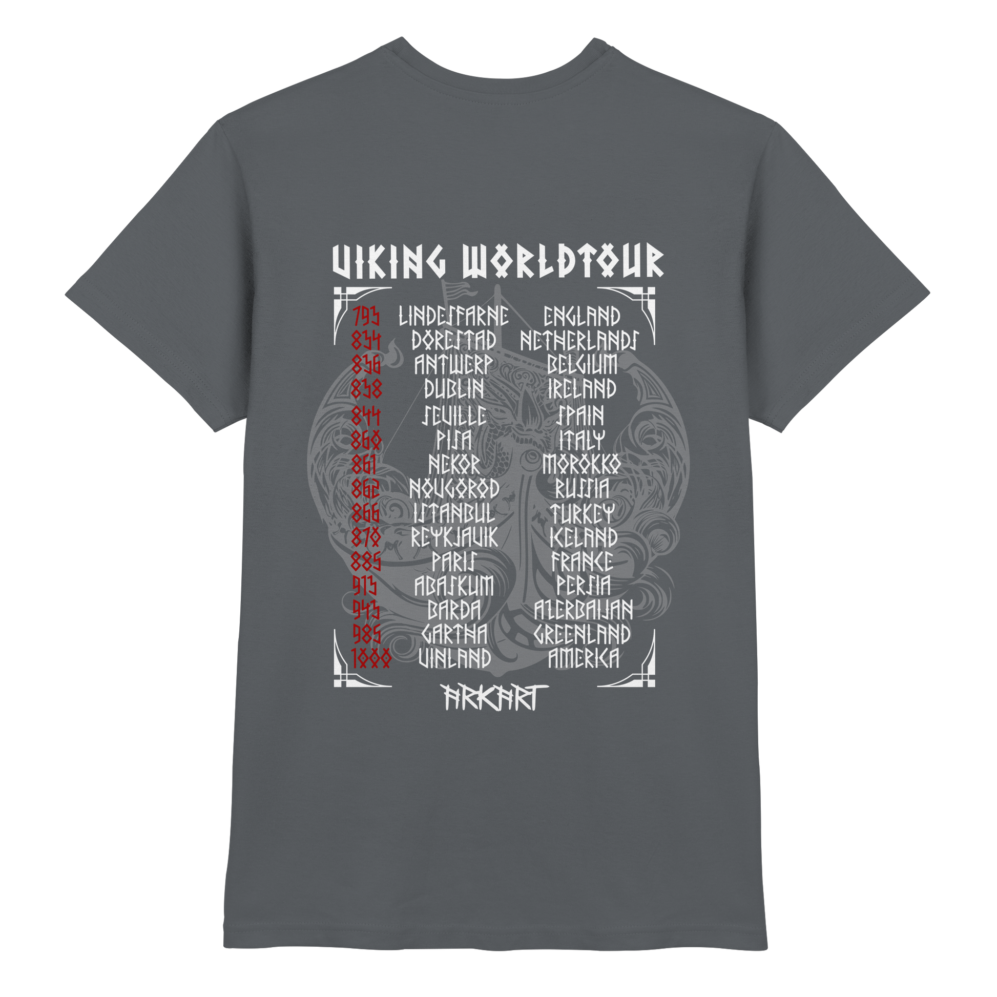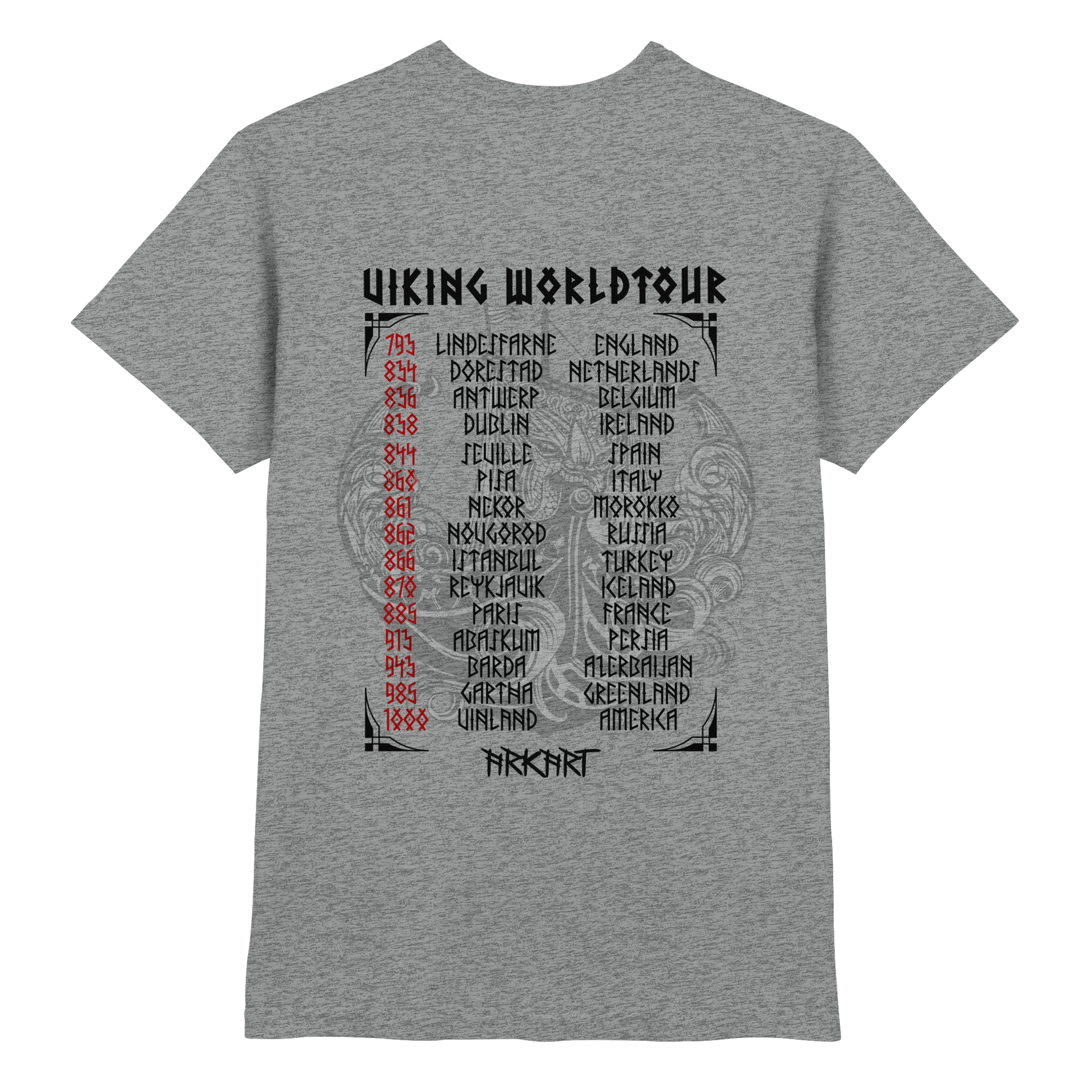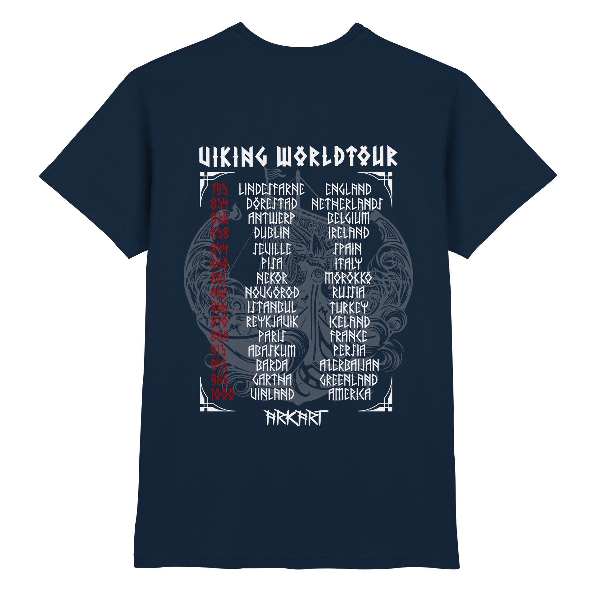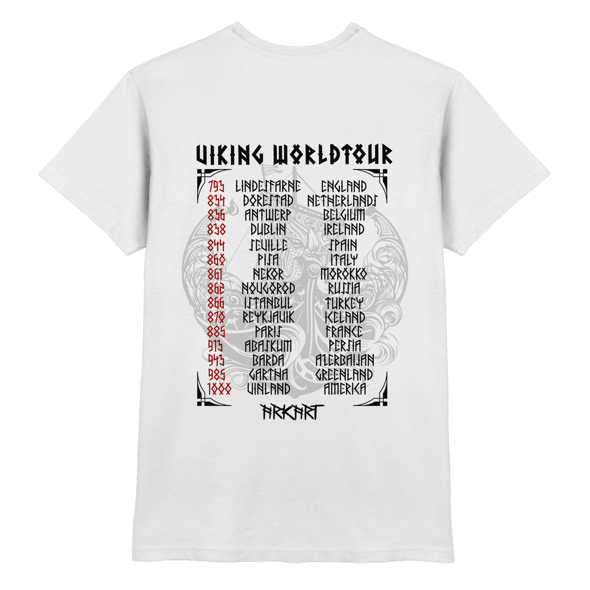 Das Tournee-Shirt listet die bekanntesten Eroberungen der Nordmänner, von Lindesfarne 793 über Paris 885 bis Vinland, ca. 1000 auf. Ein Must-have für alle, die das Abendteuer in Blut haben und den Geist des Nordens mit Stolz zeigen.